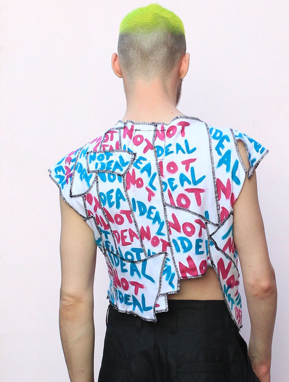 NOT IDEAL PINK AND BLUE DECONSTRUCTED PATCHWORK CROP TOP